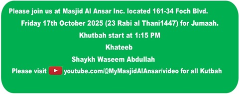 Jumaah Kutbah | 01:15 PM | Shaykh Waseem Abdullah |