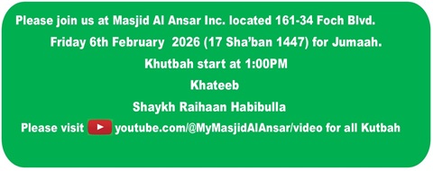| Jumaah Kutbah | 01:00 PM | Shaykh Raihaan Habibulla |