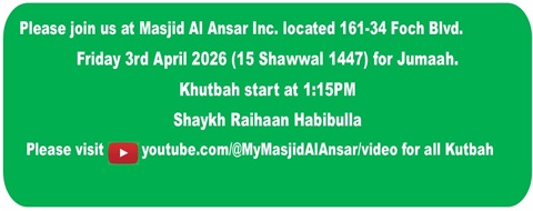 | Jumaah Kutbah | 01:15 PM | Kateeb... Ustadh Irshad Ibrahim |