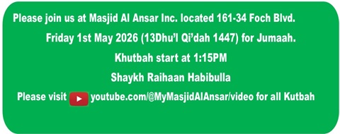 | Jumaah Kutbah | 01:15 PM | Kateeb...Bro. Nasar Hack |