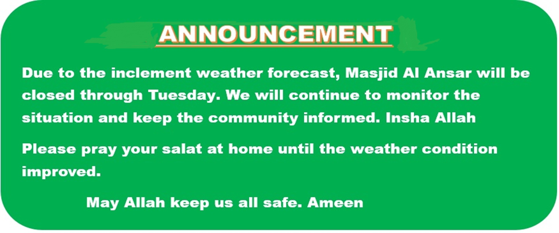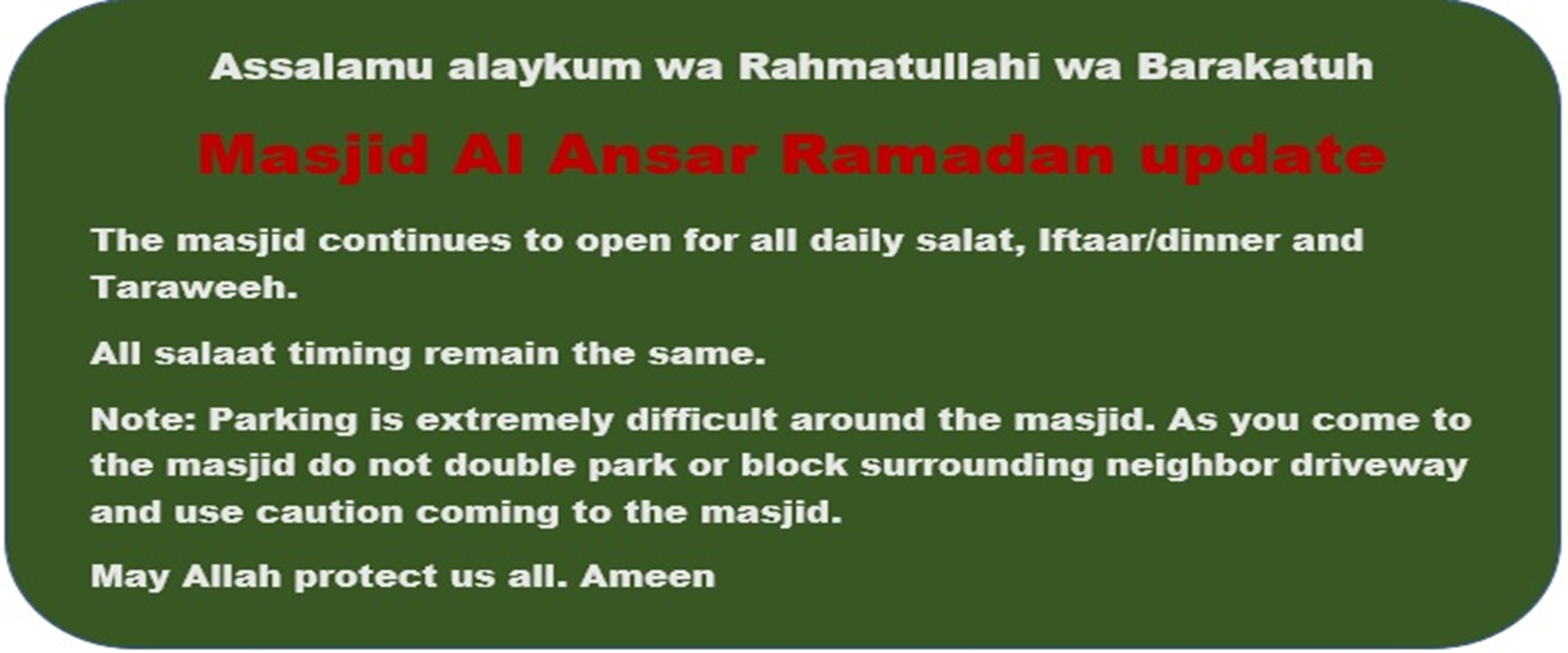 The Imaan and executive of Masjid Al Ansar Inc. would like to extend you and your family Ramadan Mubarak. As the blessed month of Ramadan start, may the crescent of the moon illuminate your path towards enlightenment and may Allah (SWT) bless you with peace, humility and grace.