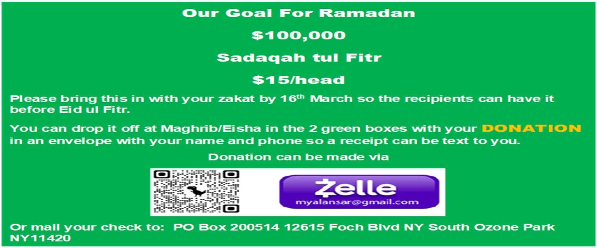During this blessed month, let us work toward getting the most benefit by increasing our ibaadat by reciting the Quran constantly, offering and improving the quality of our prayers, be more generous with our charity and constantly asking for Allah’s forgiveness. Also, during this time, please take this moment to forge a strong connection amongst our family members.